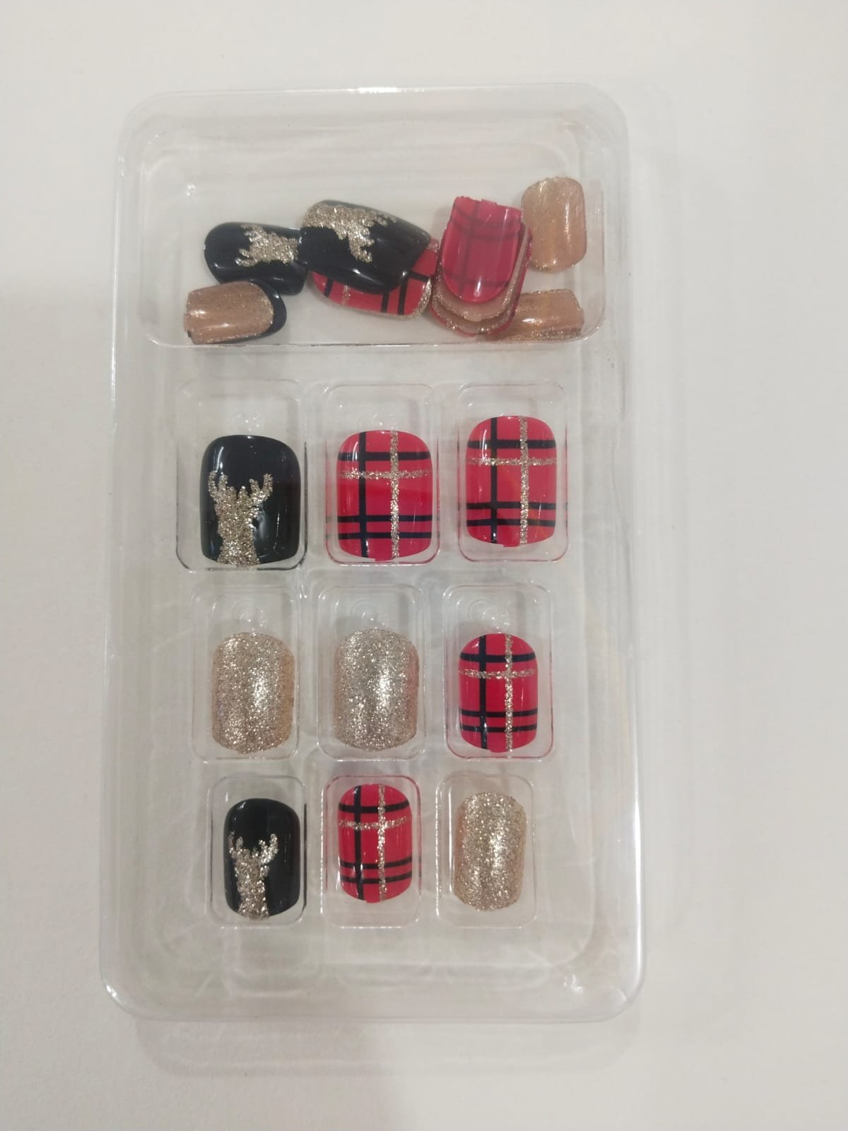 Feature highlights: HYSU’S 24-Piece Christmas Party Series Reusable Artificial Fingernails are made from lightweight ABS material. These scratch-resistant, snug-fitting nails are easy to apply and secure, perfect for Christmas-themed nail art in salons or at home. The set includes festive elements like GOLDEN REINDEER AND RED-BLACK-GOLD NAILS, offering a fun and stylish way to celebrate the season.
