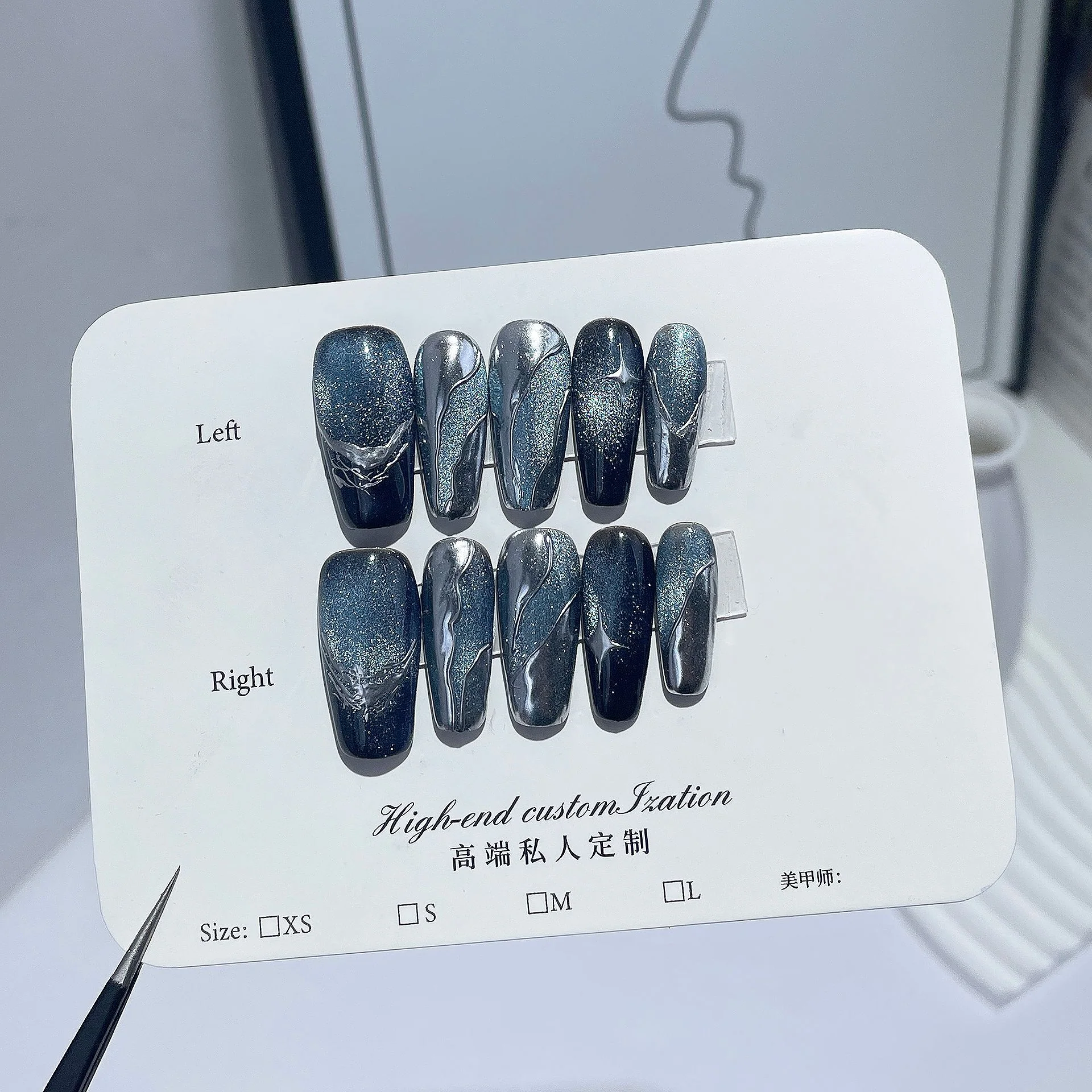 These press-on nails feature a deep galaxy-inspired gradient with shimmering blue sparkle and sleek silver chrome details, creating a dramatic and futuristic visual effect. Designed for easy application and a comfortable, secure fit, they deliver a polished, salon-quality finish suitable for both everyday styling and standout evening looks. This set is perfect for customers who enjoy cosmic themes, modern metallic touches, and bold, dimensional nail art.